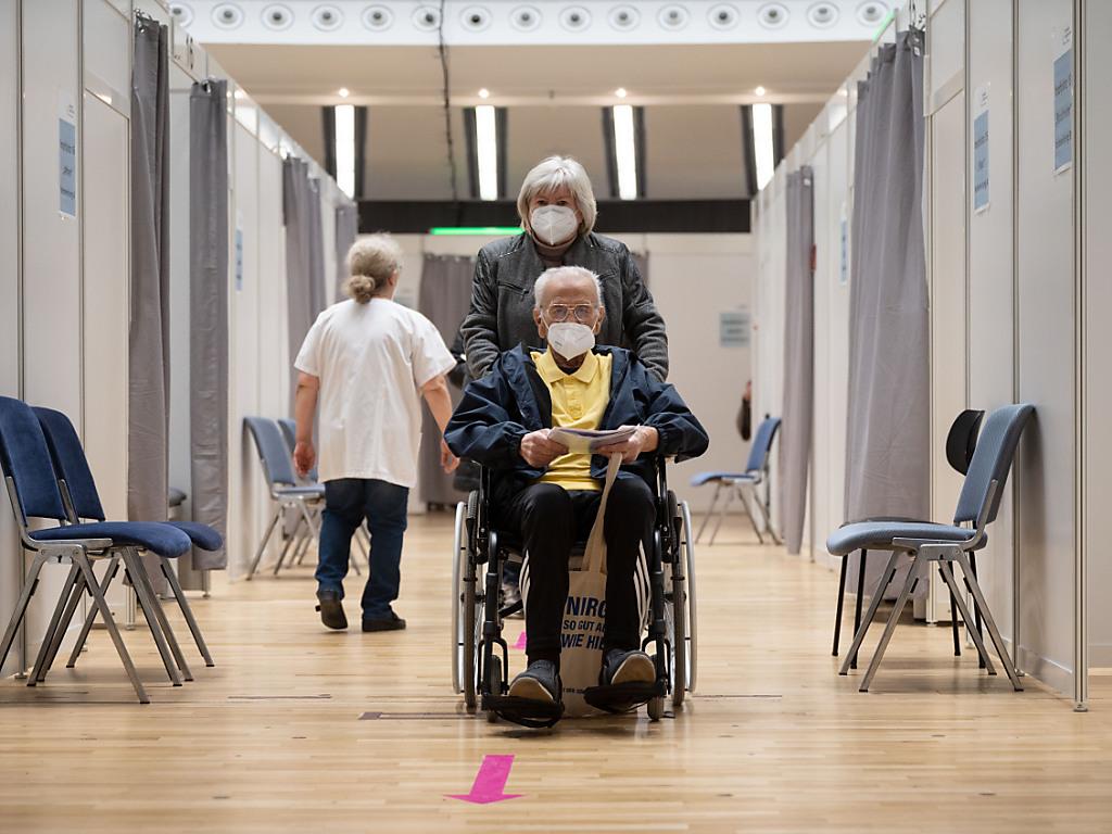 Ein Impfling wird nach seiner Impfung im Rollstuhl durch einen Gang des Impfzentrums des Klinikum Stuttgart geschoben. Foto: Marijan Murat/dpa Keystone/dpa/Marijan Murat sda-ats