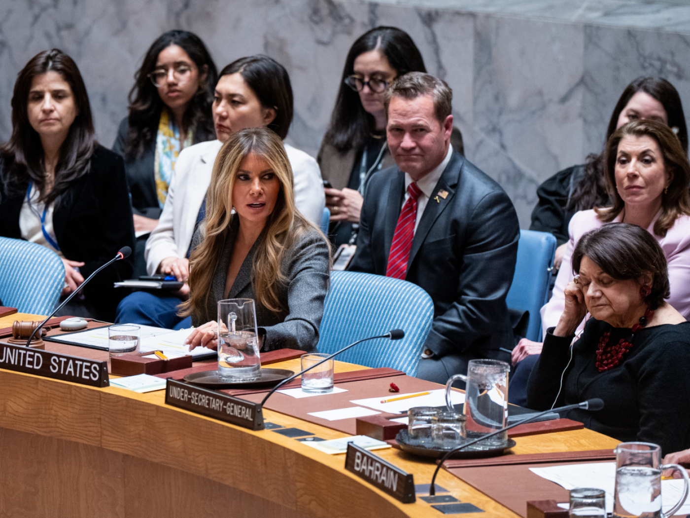 Diesmal fuhr Melania Trump in Begleitung des US-Botschafters bei den Vereinten Nationen, Mike Waltz, nach ihrer Ankunft am UN-Hauptquartier im Osten Manhattans mit derselben Rolltreppe – ohne Zwischenfall. Anschliessend schüttelte sie zur Begrüssung vor dem Sicherheitsrat die Hände der Botschafter und Botschafterinnen der anderen 14 derzeit dort vertretenen Länder und posierte lächelnd für ein gemeinsames Foto. Die anschliessende Sitzung schloss die First Lady mit dem Satz: «Ich wünsche Ihnen allen viel Kraft bei der Bewahrung des Friedens in der Welt.»