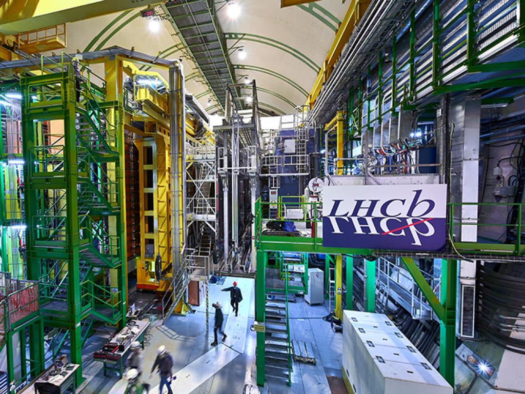 Beim im Zentrum stehenden Large Hadron Collider beauty-Experiments (LHCb-Experiment) entstehen bei der Kollision von hochenergetischen Protonenstrahlen im Teilchenbeschleuniger sogenannte Beauty-Quarks. Sie zerfallen praktisch sofort an Ort und Stelle. Forschende rekonstruieren die Eigenschaften der kurzlebigen, zusammengesetzten Teilchen anhand ihrer Zerfallsprodukte.
