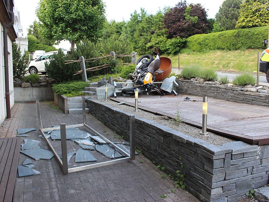 Der Lenker und seien Maschine seien über das Fahrzeug hinweggeschleudert worden. Dabei habe der Motorradlenker einen Kandelaber touchiert und sei regungslos im angrenzenden Vorgarten liegen geblieben. Das Motorrad sei weiter geschleudert und auf einem grossen Gartengrill zum Stillstand gekommen.
