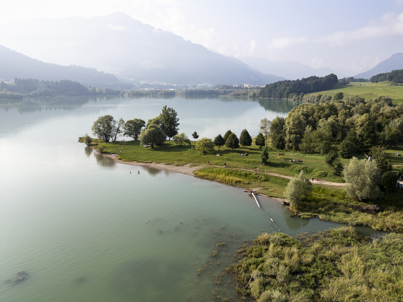 Die Polizei hat am Donnerstagnachmittag zwei Personen bei Morlon FR aus dem Greyerzersee retten können. Der niedrige Wasserstand im See hatte eine Landzunge freigelegt, auf die sich Mutter und Sohn vorgewagt hatten.