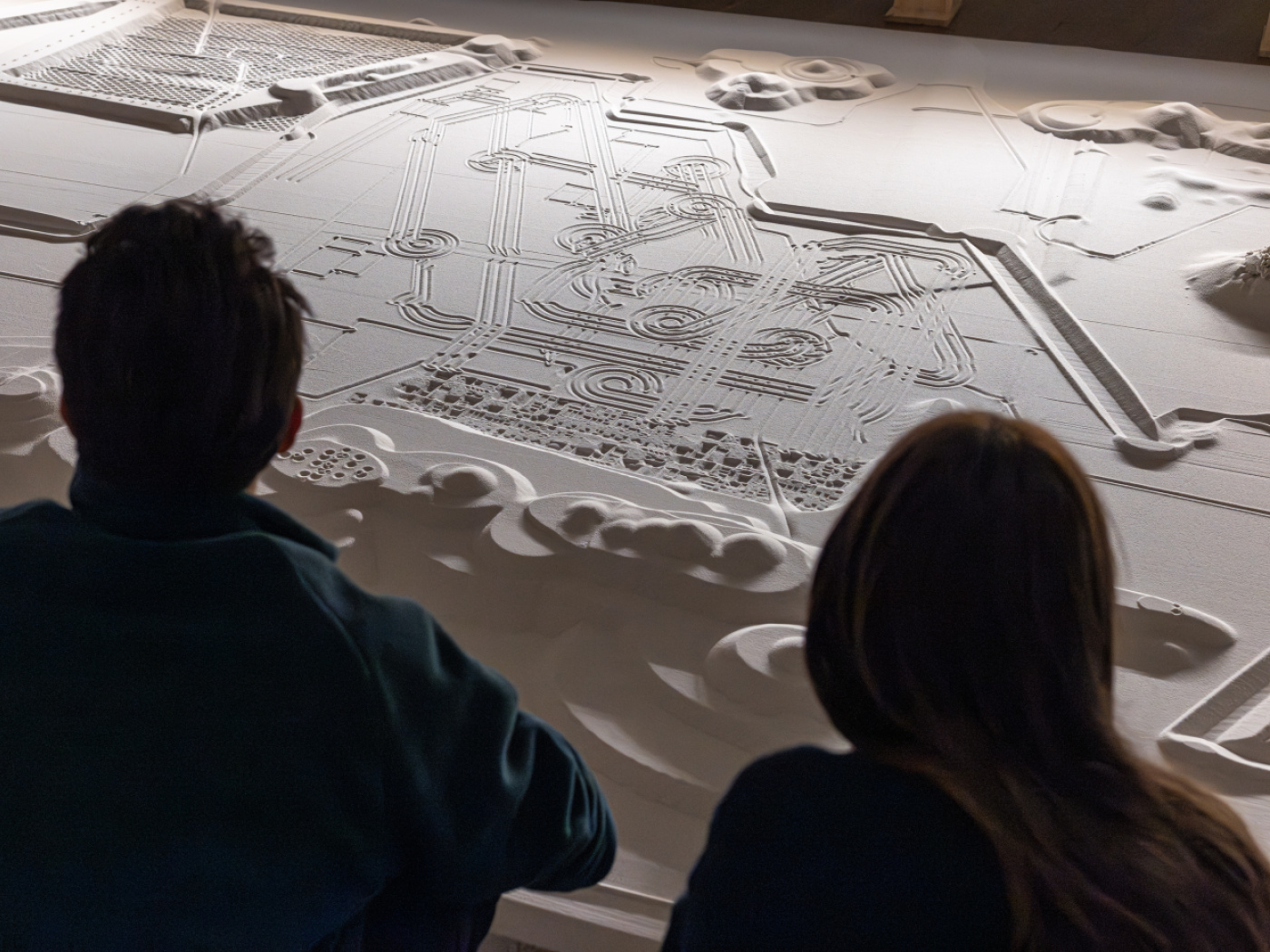 Darunter sind spektakuläre Arbeiten respektive Performances zu finden, so etwa eine Kunstaktion von 1988 am Santa Monica State Beach: Mithilfe einer riesigen Walze presste er eine Modellstadt in den Sand. Im Museum ist nun das Resultat einer Weiterentwicklung dieser Sandspiele zu sehen: Mit einem von ihm entwickelten dreidimensionalen Plotter kreierte er an Ort und Stelle eine grosse futuristisch wirkende Sandlandschaft.