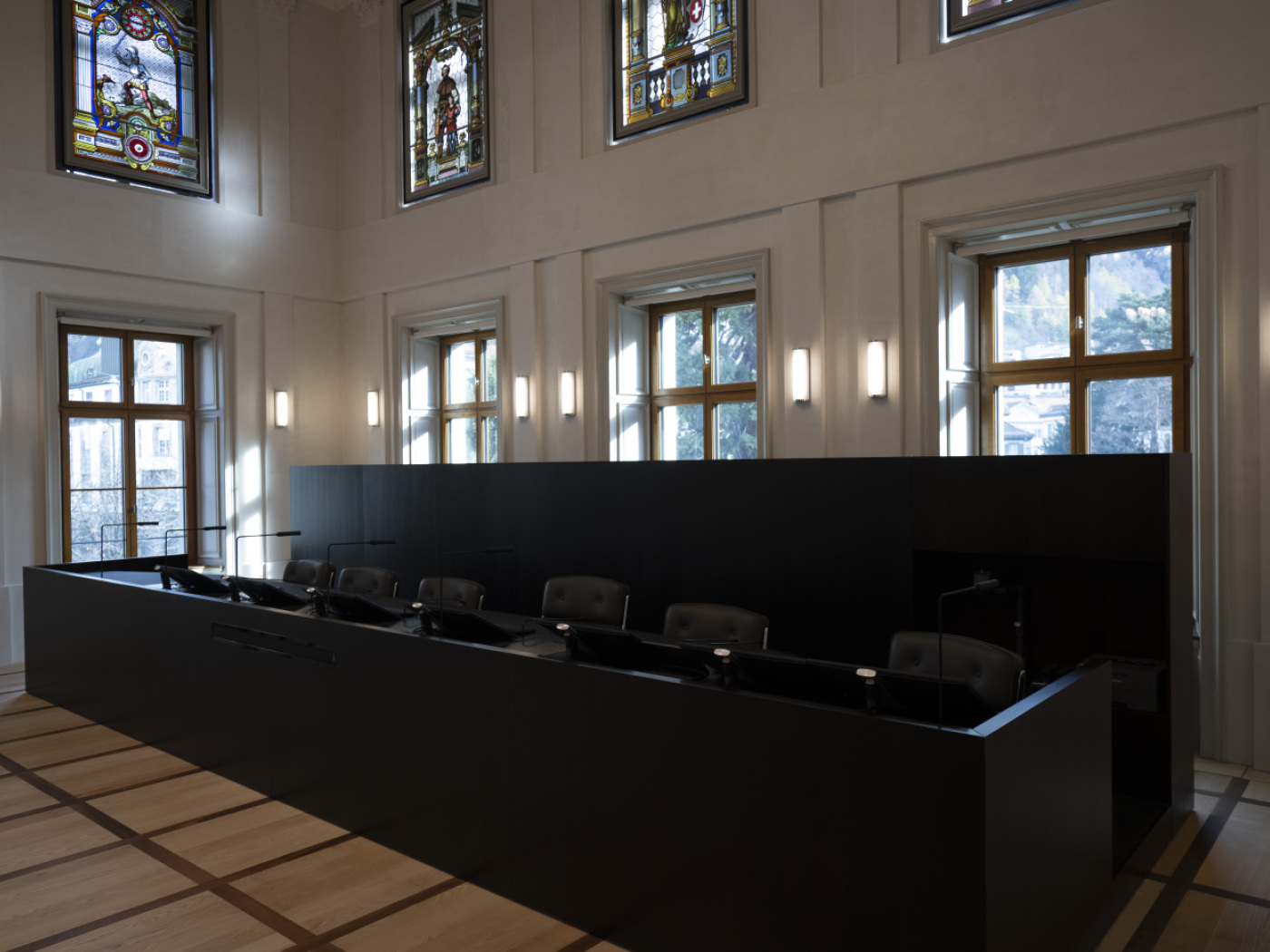 «Highlight ist der neue grosse Gerichtssaal», erklärte die Vorsteherin des Departements für Infrastruktur, Energie und Mobilität. Es handele sich dabei um den ursprünglichen Grossratssaal, für dessen Wiederherstellung eine vor Jahrzehnten eingezogene Zwischendecke habe herausgerissen werden müssen.