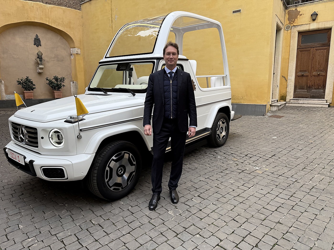 Das vollelektrische Modell ist eine Weiterentwicklung des Elektro-Geländewagens G580. Mit dem eigens angefertigten Getriebe kann es auch über längere Strecken in Schrittgeschwindigkeit unterwegs sein. Der Papst sitzt praktisch hinten auf der Ladefläche: auf einem erhöhten Stuhl, der gedreht werden kann. So kann er sich in alle Richtungen zeigen und winken. Für schlechtes Wetter gibt es einen Aufsatz.