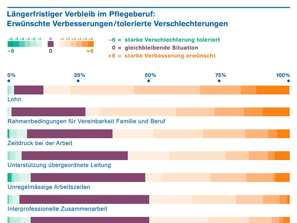 Angesichts des prognostizierten Mangels an Pflegefachkräften am wichtigsten sind die Antworten auf die Frage nach den Bedingungen für den längerfristigen Verbleib im Beruf. Fast 90 Prozent nannten hier einen besseren Lohn.