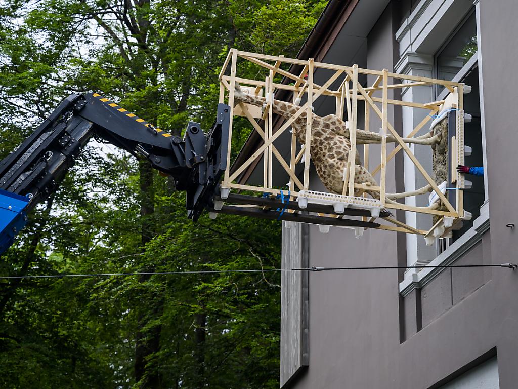 (Keystone-SDA) Sonderbarer Anblick für Passanten in La Chaux-de-Fonds: Eine Giraffe und andere grosse ausgestopfte Tiere waren am Mittwoch auf einem Transport durch die Stadt im Neuenburger Jura zu sehen.