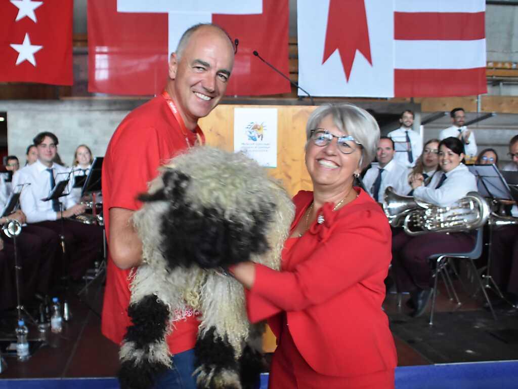 Christophe Darbellay, der Regierungspräsident des EhrenkantonWallis, überreichte der Schafhalterin Baume-Schneider ein Schwarznasenschaf. Das Schaf heisse Petite Arvine (Walliser Weissweinsorte), sagte Darbellay.