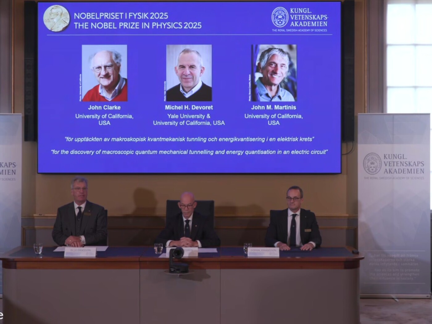 Der Nobelpreis für Physik geht in diesem Jahr an die in den USA forschenden Quantenphysiker John Clarke, Michel Devoret und John Martinis. Das teilte die Königlich-Schwedische Akademie der Wissenschaften in Stockholm mit. Die Experimente der Preisträger zeigten Quantenphysik in Aktion.