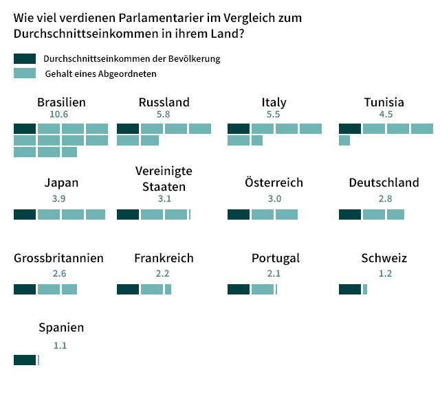Vergleicht man den Durchschnittslohn eines Landes mit jenem der Parlamentarier, so stehen die brasilianischen Abgeordneten am besten da: Sie verdienen zehn Mal so viel wie ein durchschnittlicher Bürger. Im Gegensatz dazu geht es den spanischen AbgeordnetenExterner Link weniger gut. Deren feste Vergütung ist praktisch identisch mit dem Medianlohn in ihrem Land und damit die tiefste in ganz Europa.