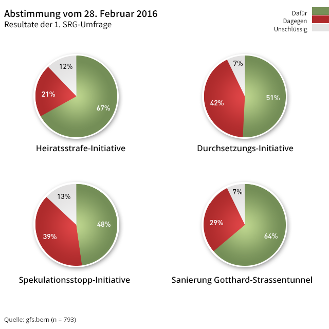 Die 1. Umfrage zu den Volksabstimmungen vom 28. Februar 2016 wurde vom Institut gfs.bern durchgeführt, im Auftrag der Schweizerischen Radio- und Fernsehgesellschaft (SRG), zu der auch swissinfo.ch gehört.Zwischen dem 11. und 15. Januar wurden 1213 repräsentativ ausgewählte Stimmberechtigte befragt.