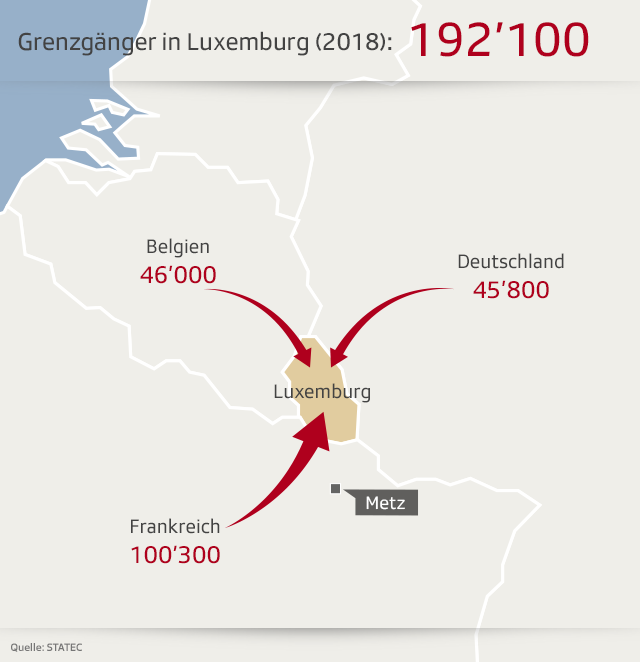 Dies ist vor allem auf eine Regel der OECD zurückzuführen, die Luxemburg buchstabengetreu anwendet, und nach welcher die Einkommenssteuer generell dort erhoben wird, wo jemand arbeitet. Dieser Mangel an Solidarität ärgert in den benachbarten Regionen des Grossherzogtums die politisch Verantwortlichen an höchster Stelle. Sie stehen unter Druck, da ihnen die nötigen Mittel fehlen, um den massiven Zuzug von Grenzgängerinnen und Grenzgängern (etwa 5500 pro Jahr) auf ihr Gebiet bewältigen zu können; sie sagen, sie seien dem Ersticken nahe.