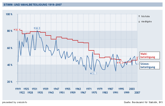 In den ersten rund 120 Jahren ihrer Existenz als Bundesstaat blieb es – gemessen an der Gesamtbevölkerung – einer Minderheit vorbehalten, sich politisch zu artikulieren. Doch auch nach 1971 änderte sich an diesem Umstand wenig. Seit Mitte der 1950er-Jahre geht im Durchschnitt nur jede zweite stimmberechtigte Person bei Abstimmungen an die Urne.
