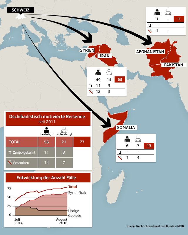 Das Verfahren könnte aufgrund der zahlreichen rechtlichen Tücken noch längere Zeit in Anspruch nehmen. Doch falls es zu einem Entscheid kommt, könnte dieser Schule machen und auf andere Fälle angewendet werden. Von den 77 Dschihad-Reisenden aus der Schweiz, die bis Juli 2016 vom Nachrichtendienst des Bundes (NDB) erfasstExterner Link wurden, sind 17 Doppelbürger.