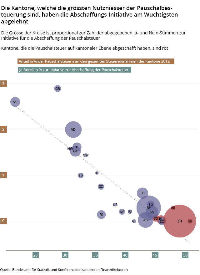 Die folgende Grafik veranschaulicht diesen Trend, indem die gesamten Steuereinnahmen der Kantone im Jahr 2012 (geschätzt) in Relation zum Ja-Anteil für das Begehren gesetzt wurden.