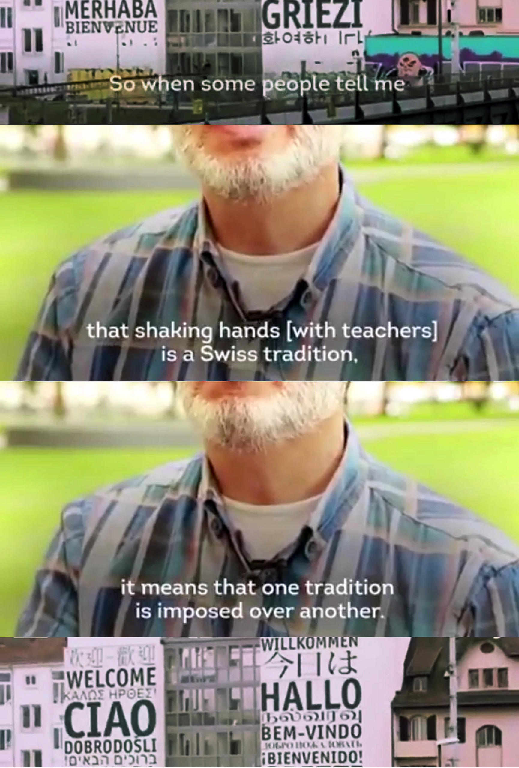 Rechtslage: Dass das Nichteinhalten von gesellschaftlichen Gepflogenheiten zu Strafen führen soll, ist ähnlich unrealistisch wie das Nichteinhalten von «Werten» (siehe oben). Laut Epiney muss man hier auch zwischen Staat und Privaten unterscheiden. Ein privater Arbeitgeber habe mehr Spielraum als der Staat. Der Staat brauche hingegen eine gesetzliche Grundlage und ein öffentliches Interesse, um eine «Gepflogenheit» einfordern zu können. Beim Schwimmunterricht ist das beispielsweise gegeben: Laut BundesgerichtExterner Link müssen auch muslimische Schülerinnen am Schwimmunterricht teilnehmen, weil das öffentliche Interesse an der Integration es erlaube, die Glaubensfreiheit einzuschränken.