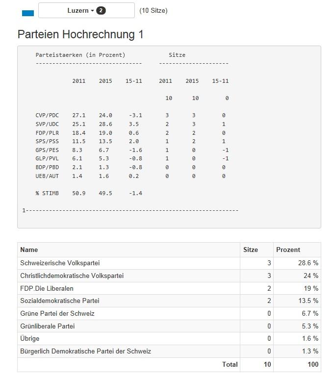 SVP und SP dürften im Kanton Luzern gemäss Hochrechnung je einen Nationalratssitz der Grünen und der GLP ergattern. SVP und CVP kämen somit auf je 3 Sitze, FDP und SP auf je 2. Sollte sich die Hochrechnung bewahrheiten, könnten Grüne und GLP keine Abgeordnete mehr nach Bern schicken.