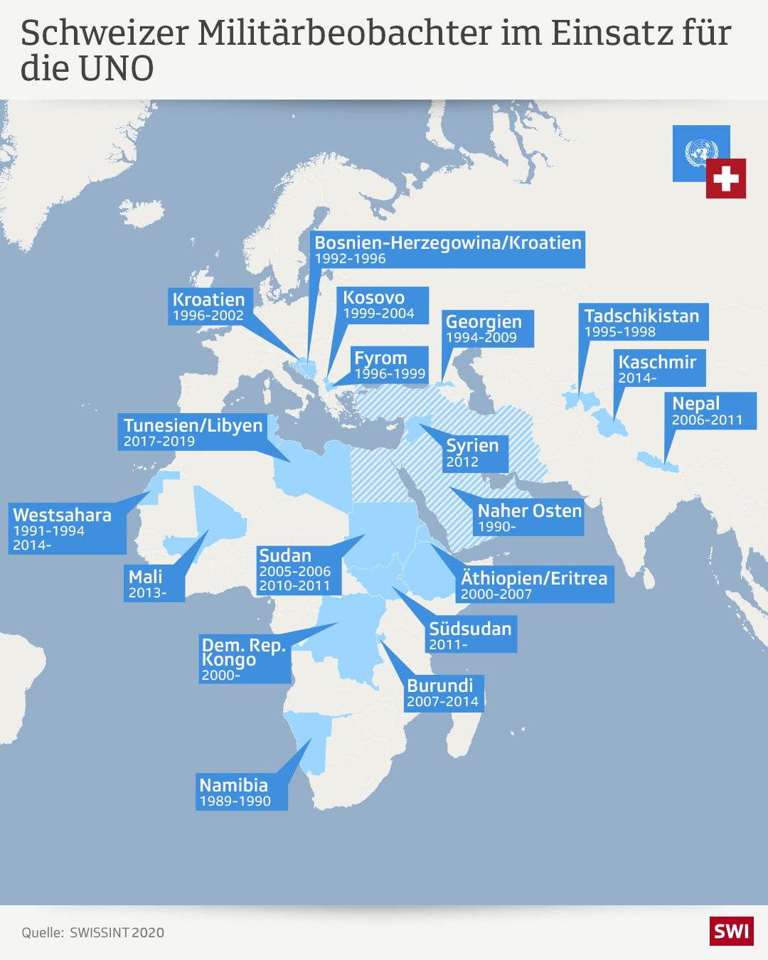 Vor 30 Jahren beteiligte sich die Schweiz erstmals mit Militärbeobachtern an einer UNO-Friedensmission. Heute stehen 27 Militärbeobachter und Verbindungs- sowie Stabsoffiziere in folgenden Regionen im Einsatz: Naher Osten (13), Demokratische Republik Kongo (2), Südsudan (1), Mali (6), Kaschmir (3) und Westsahara (2).
