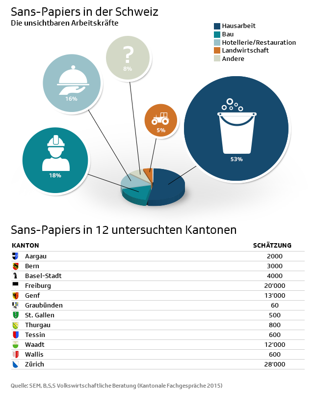 Es wird geschätzt, dass in der ganzen Schweiz etwa 73’000 so genannte Sans-Papiers leben, davon etwa 13’000 in Genf. Viele von ihnen stammen aus Südost-Europa oder den Philippinen und sind illegal als Hausangestellte beschäftigt.