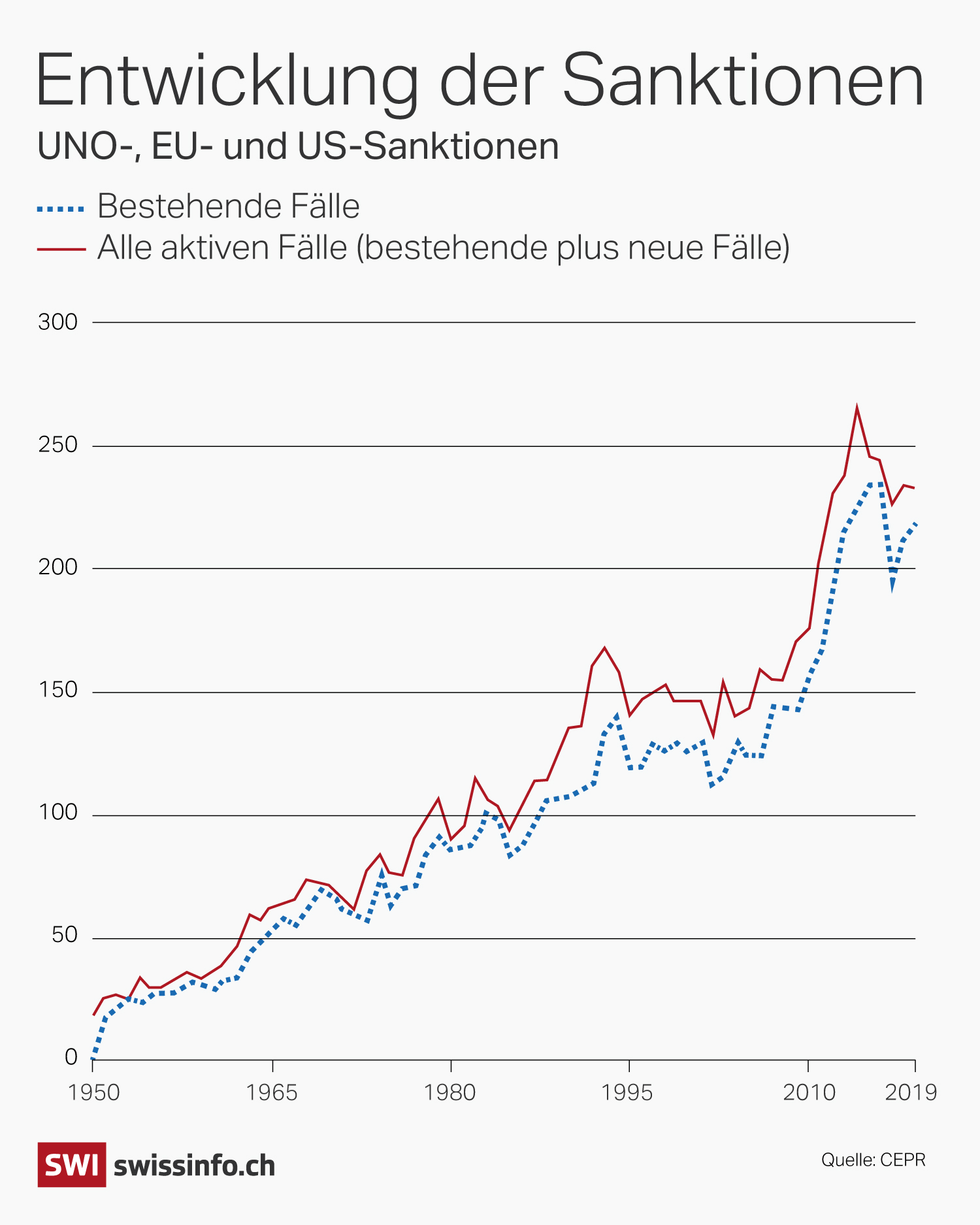 Die ursprüngliche Idee moderner Sanktionen war es, Aggressoren zu bestrafen und Verbündeten zu helfen. In der Zwischenkriegszeit, als sich die Staats- und Regierungschefs der Welt in Genf trafen, um Handelsbeschränkungen als Instrument des Völkerbunds zu entwickeln, wurde das Aushungern der Zivilbevölkerung im Feindesland als eine der Folgen in Kauf genommen.
