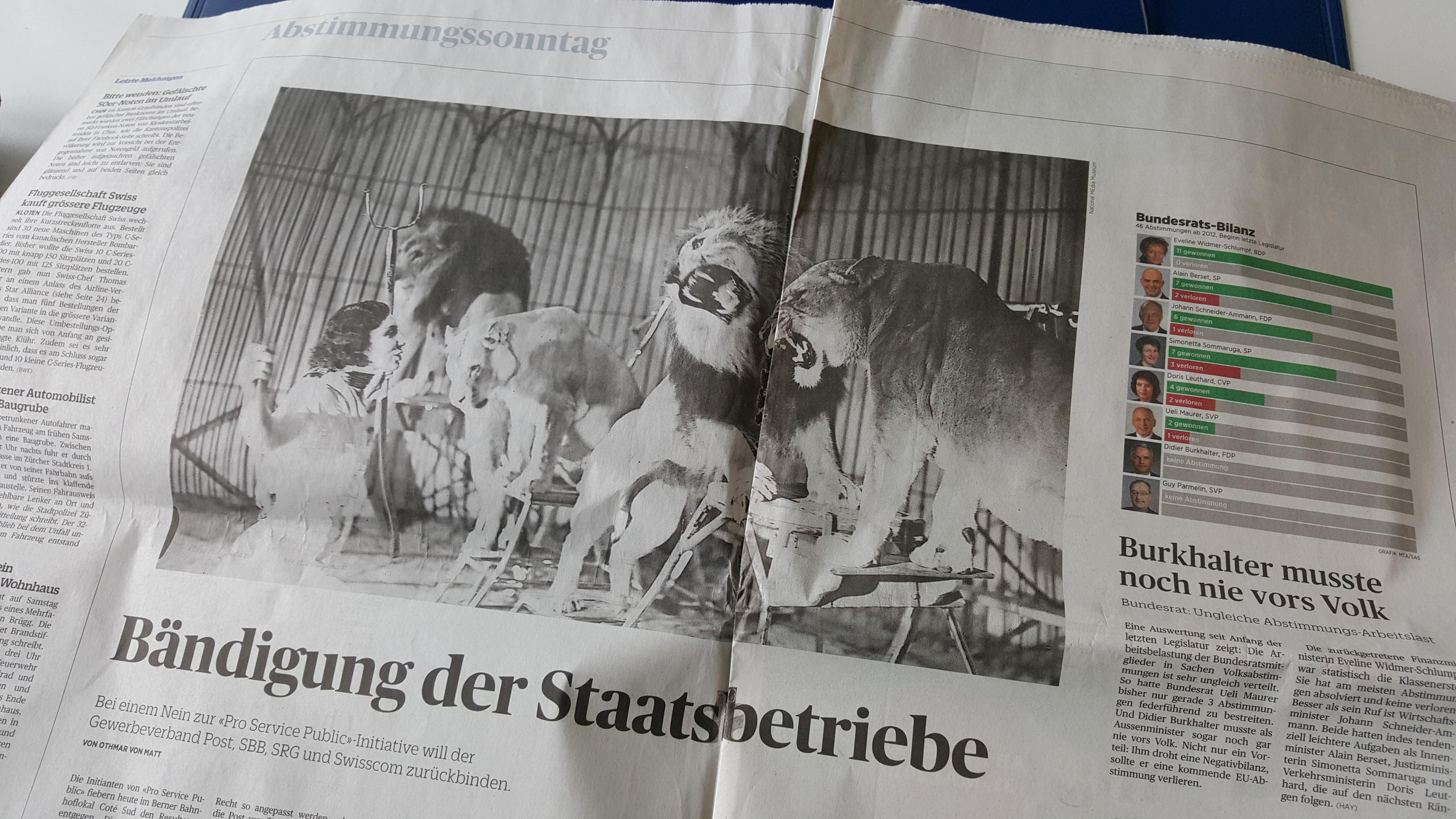 Die Ablehnung der Initiative sei keine Absage an den Service-public, kommentierte Bundesrätin Doris Leuthard vor den Medien. Das deutliche Resultat zeige viel mehr, dass der Service public in der Schweiz gut funktioniere. Die bundesnahen Betriebe müssten sich jedoch der heutigen Zeit anpassen, die Initiative hätte die dafür nötigen finanziellen Mittel weggenommen. «Was ist Grundversorgung?», fragt Doris Leuthard in die Runde. Diese politische Diskussion werde man führen, betont Leuthard. «Der Bundesrat ist daran, die Situation bei den bundesnahen Unternehmen zu prüfen», sagt Leuthard. «Das Votum ist Ansporn, das ausgezeichnete Niveau des Service public aufrechtzuerhalten und zu steigern», sagt Leuthard. «Auch in Zukunft wollen wir die beste Grundversorgung der Welt bieten.»