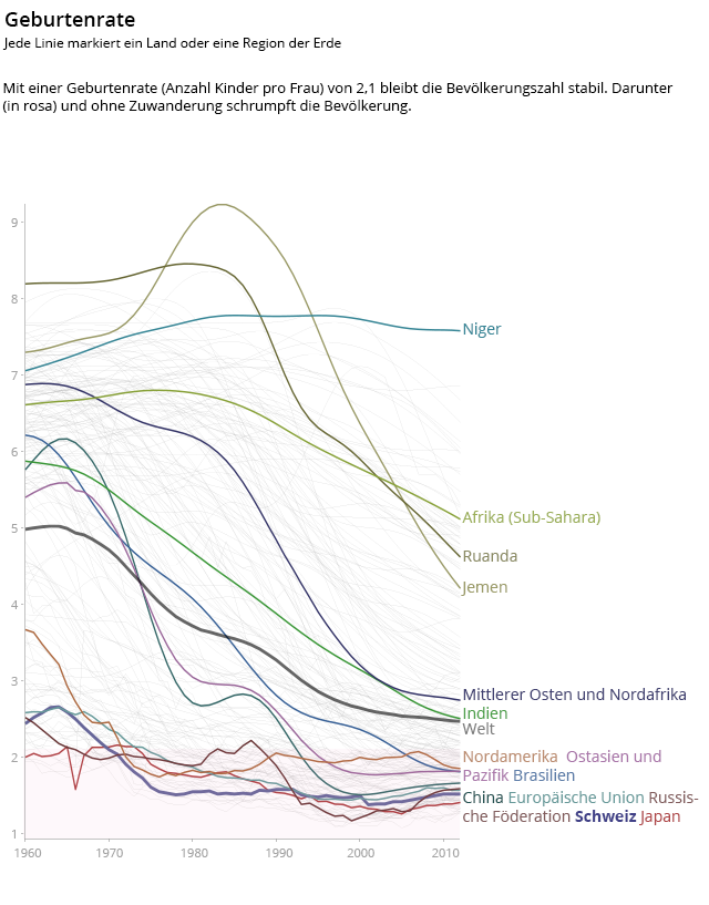 Im Vergleich dazu ist die Geburtenrate (Anzahl Kinder pro Frau) im letzten halben Jahrhundert stärker abgesackt. Weltweit von 5 auf 2,5. In der Schweiz ist sie in der Zeitspanne von 2,5 auf 1,5 zurückgegangen. Damit liegt der Wert unterhalb der Schwelle der demographischen Erneuerung. Mit anderen Worten: Die Schweizer Bevölkerung schrumpft. Oder vielmehr schrumpfte. Denn heute vermag die Zuwanderung die Lücke zwischen der Zahl der Geburten und der Todesfälle mehr als nur zu kompensieren.
