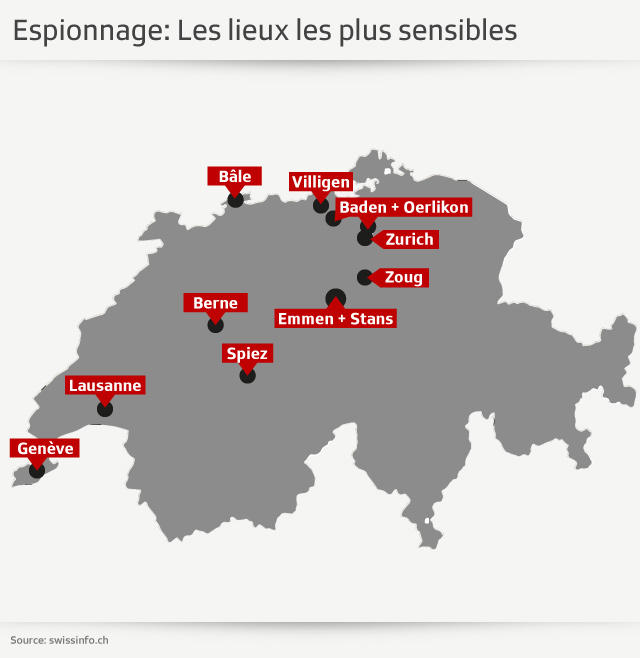 Die Schweiz ist schon seit langer Zeit von Spionage-Aktivitäten auf ihrem Territorium betroffen, besonders wegen der Präsenz zahlreicher internationaler Organisationen. swissinfo.ch hat die Top-Ten der potenziellen Ziele für Spione ermittelt.