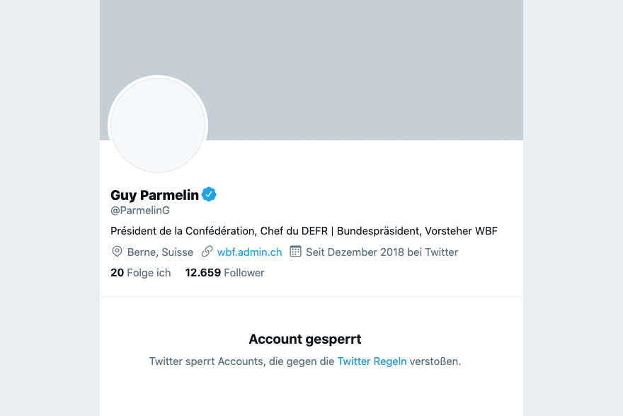 Am 20. Januar hat Twitter vier Accounts eines Schweizer Politikers der rechtskonservativen Schweizerischen Volkspartei (SVP) gesperrt. Das Mitglied des Parlaments des Kantons Zürich war für seine Provokationen bekannt. 2016 war er wegen übler Nachrede verurteilt worden.