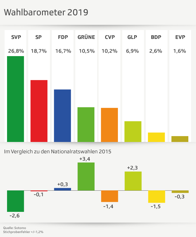 Die SVP ist die Partei mit den grössten Verlusten. Sie dürfte gegenüber 2015 rund 2,6 Prozentpunkte einbüssen. Trotzdem wird sie voraussichtlich mit einem Wähleranteil von 26,8% stärkste Partei bleiben. «Die SVP befindet sich derzeit nicht in ihrer besten Form. Trotz der erwarteten Verluste bleibt die Partei aber mit Abstand die stärkste und verliert derzeit weniger als einen Zehntel ihrer Wählerschaft», schreibt Sotomo.