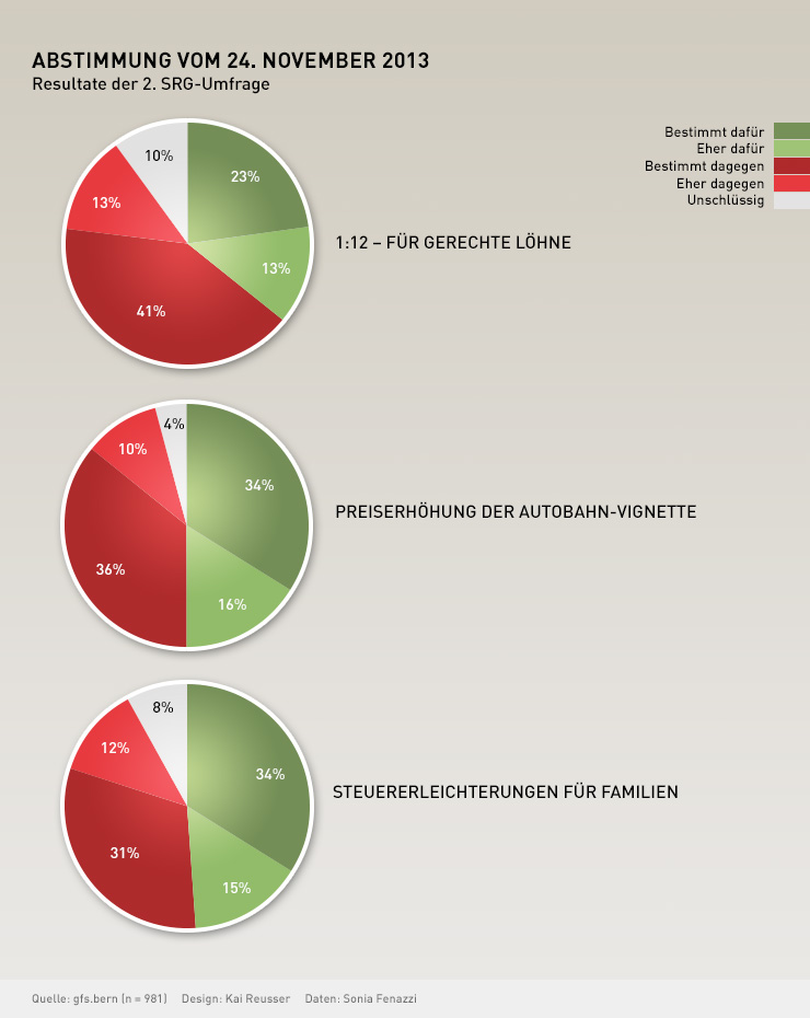 Drei Wochen vor der Abstimmung vom 24. November haben die Gegner aller drei Vorlagen an Zulauf gewinnen können. So lehnen in der 2. Umfrage 54% die 1:12-Initiative ab, nur noch 36% sagen Ja.