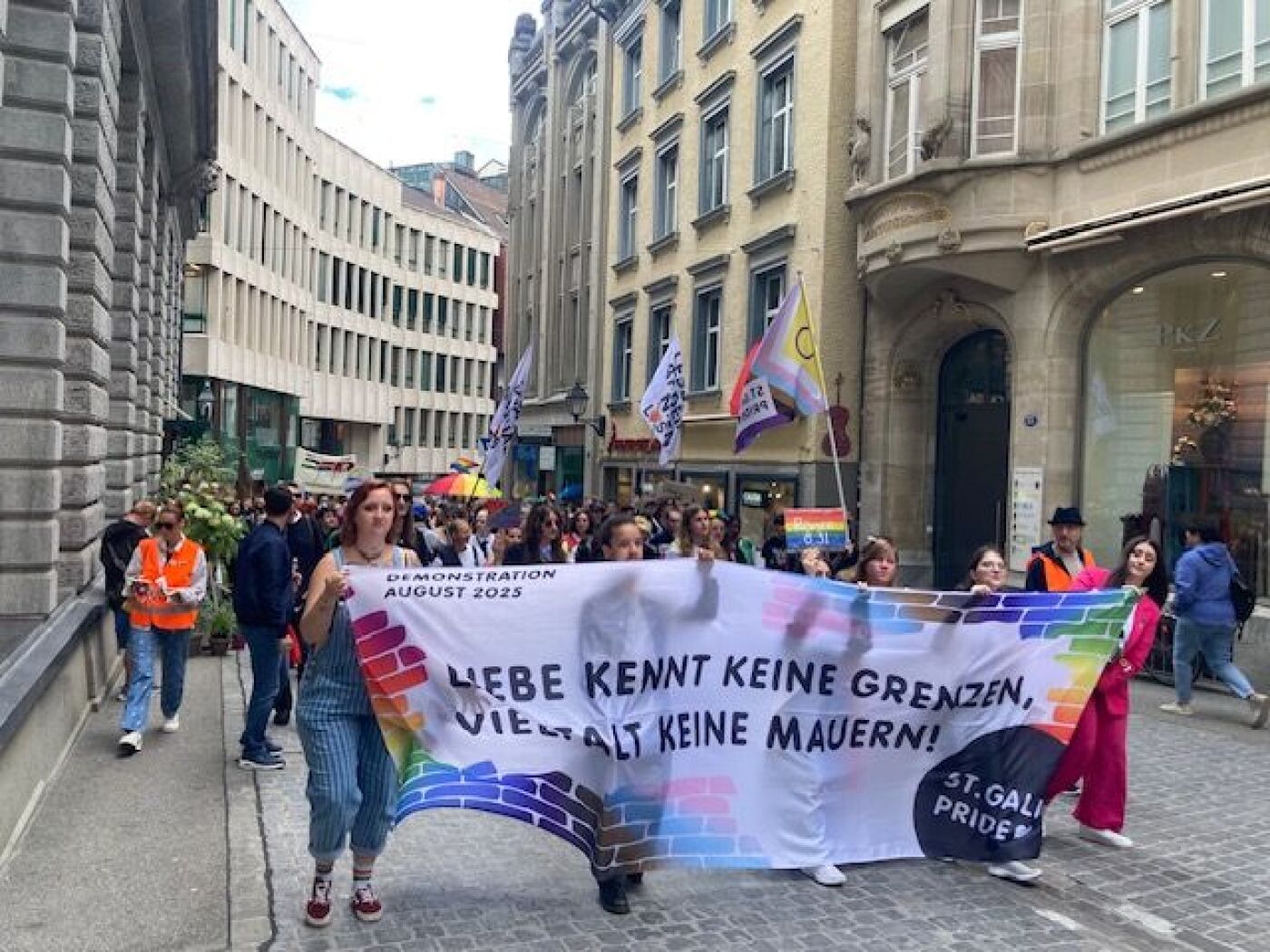 Mehr als 2000 Menschen nahmen am Samstagnachmittag an der nach 2023 zweiten Pride in St. Gallen teil. Die Kundgebung, die mit einem Demonstrationszug durch die St. Galler Innenstadt begann, stand unter dem Motto "Liebe kennt keine Grenzen, Vielfalt keine Mauern".