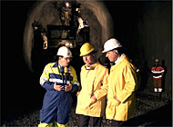 Nach dem Mittagessen besuchte Prinz Charles die Baustelle der Alpenbahn NEAT. Am Lötschberg ist der Tunnel Mitholz im Bau. Dort liess er sich im Beisein vom Direktor des Bundesamtes für Verkehr, Max Friedli, am Ende des Stollens des Zwischenangriffs den Vortrieb für die NEAT-Röhre durch die Berge zwischen dem Berner Oberland und dem Wallis zeigen.