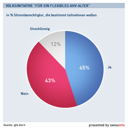 Wäre Mitte November 2008 über die AHV-Initiative der Gewerkschaften abgestimmt worden, hätten sie 45% der Stimmbürger angenommen, 43% dagegen abgelehnt. 12% sind noch unentschlossen.