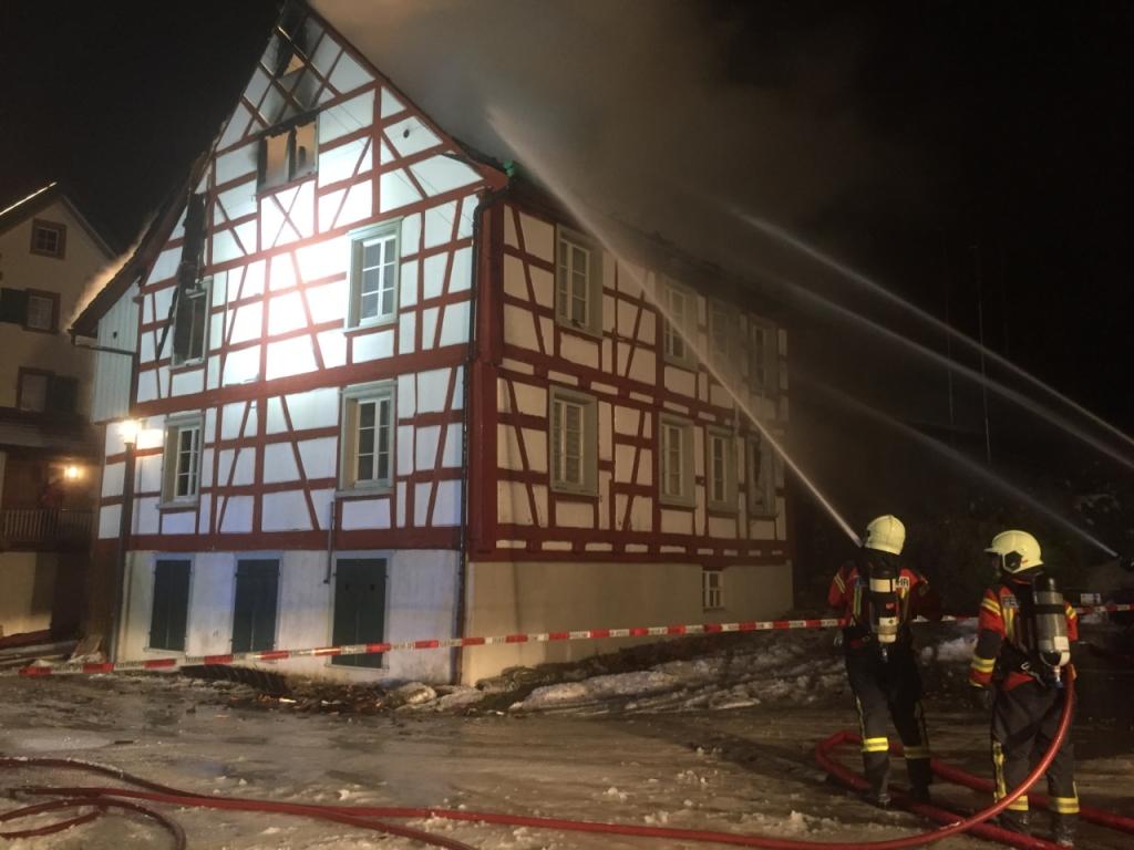 Um halb fünf Uhr hatten Anwohner der Liegeschaft an der Hinterdorfstrasse die Notrufzentrale alarmiert, weil sie Rauch bemerkt hatten. Als die Feuerwehr eintraf, stand der Riegelbau bereits im Vollbrand.
