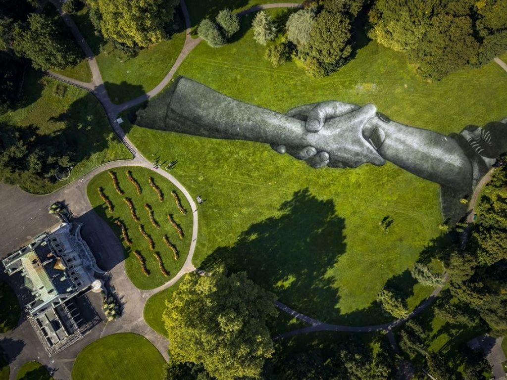 (Keystone-SDA) Der französisch-schweizerische Künstler Saype hat in Genf ein riesiges Land-Art-Gemälde in die Parcs des Bastions und La Grange gemalt. Das Werk ist 160 Meter lang und 30 Meter breit und zeigt zwei Arme mit Händen, die sich umfassen.