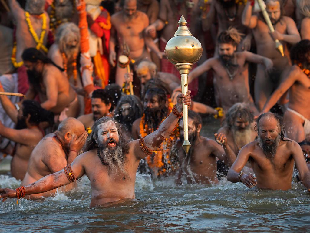 Den zeremoniellen Auftakt machten heilige Männer verschiedener hinduistischer Orden, die bei Sonnenaufgang safranfarben gekleidet ins Wasser stiegen. Rund 200’000 Pilger sollten ihnen allein laut Veranstaltern am Dienstag noch folgen. Hindus glauben, dass ein Bad in jenem Gewässer die Sünden abwaschen und den Kreislauf der Wiedergeburt stoppen kann.