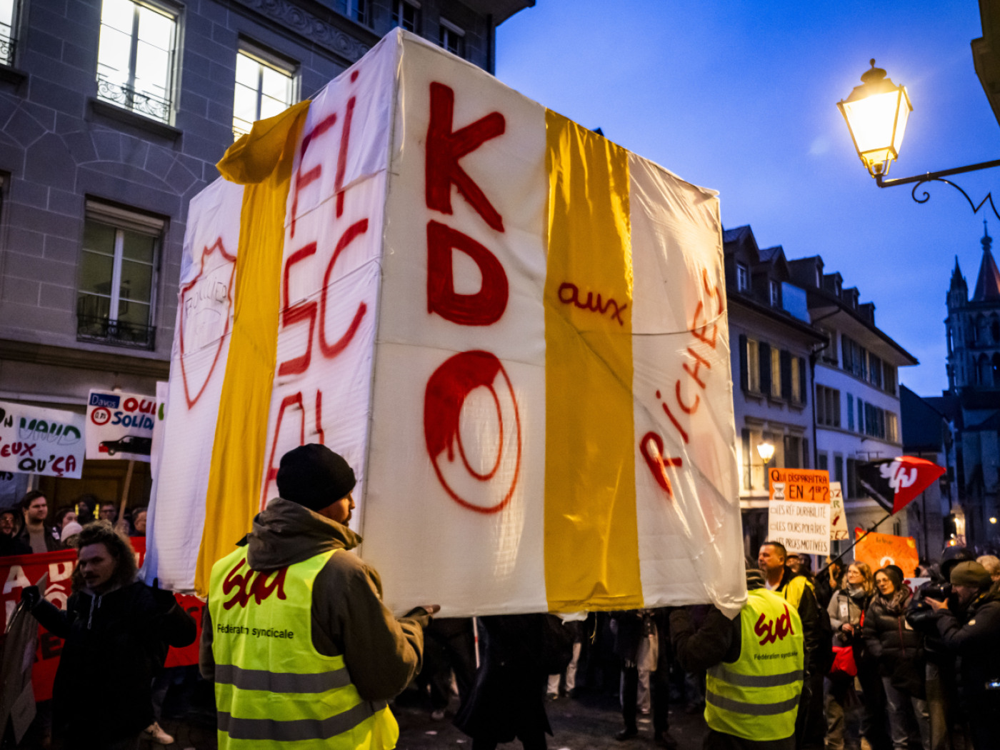 Die Gewerkschaften legten vor dem Eingang des Grossen Rates einen riesigen weissen Würfel aus Pappe nieder, der das Steuergeschenk des Steuerschilds für sehr reiche Menschen symbolisieren sollte. Die Gewerkschaften hatten die Teilnehmer eingeladen, bis 22 Uhr zu bleiben.
