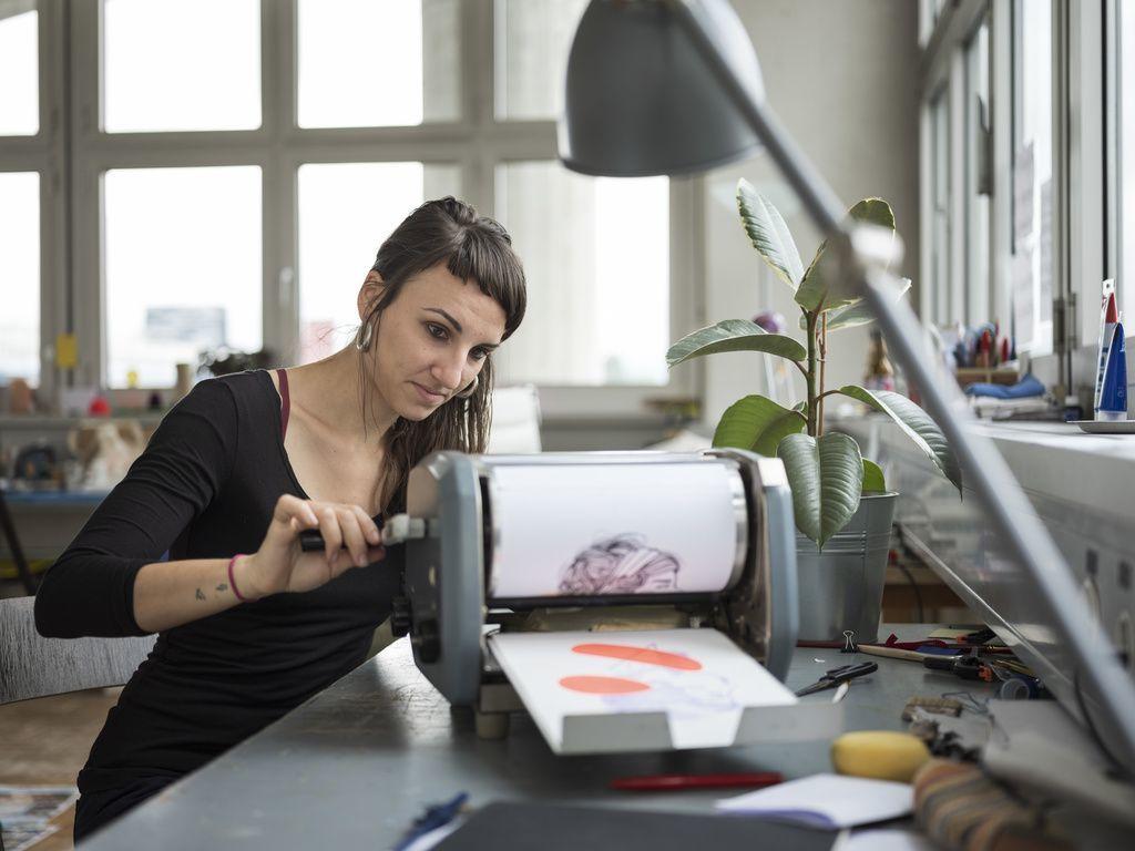 Der Verlust schmerzte, und entsprechend intensiv war Sandra Staubs Wunsch nach Neuem, das sie ausfüllen und inspirieren würde. Der Entscheid für ein Masterstudium in Visueller Kommunikation an der ZHdK fiel ihr leicht, aber die Suche nach einem Master-Thema dauerte lang. Der Funke wollte und wollte nicht springen. Die Schnapspresse änderte dann alles. «Ich war fasziniert vom Nicht-Perfekten dieser Drucktechnik und von der Autonomie, die das Gerät ermöglicht. Für mich tat sich damit ein neues Feld auf.»