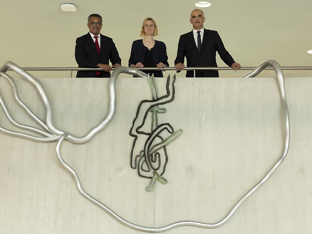 (Keystone-SDA) «Früchte tragen» heisst eine monumentale Skulptur der Künstlerin Simone Holliger. Das Werk ist ein Geschenk der Schweiz an die Weltgesundheitsorganisation WHO. Am Sonntag haben es Bundesrat Alain Berset und WHO-Generaldirektor Tedros Adhanom Ghebreyesus eingeweiht.