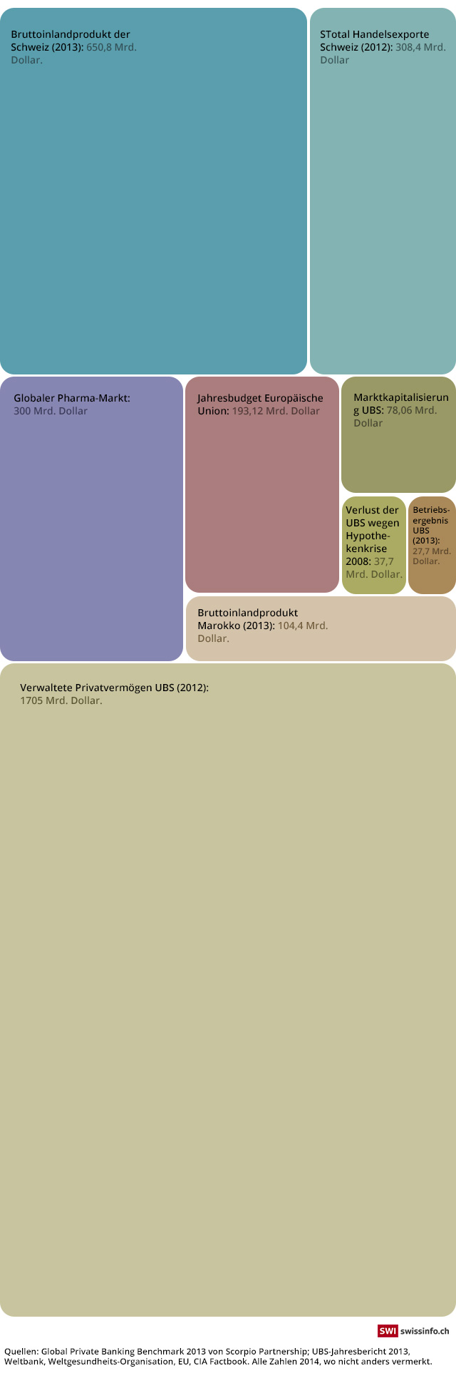 Die von der UBS verwalteten Guthaben entsprechen dem Zwanzigfachen der Marktkapitalisierung der Bank oder dem Dreifachen des jährlichen BIP der Schweiz. 2012 wurde das gesamte Vermögen, das von Schweizer Privatbanken verwaltet wurde, auf 6150 Mrd. Dollar geschätzt. Die Summe entspricht dem Dreifachen des BIP der EU oder der USA. Die Hälfte davon wurde von den beiden grössten Banken des Landes verwaltet, UBS und Credit Suisse. Mehr als die Hälfte dieses Kapitals ist im Besitz von ausländischen Investoren. Die Schweiz ist gegenwärtig führend in der Verwaltung von sogenanntem Offshore-Vermögen, die gemäss Schätzungen weltweit 8500 Mrd. Dollar betragen.