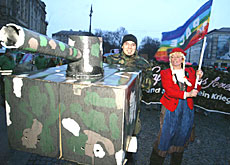 Demonstranten fuhren mit einem Papp-Panzer gegen die Müncher Sicherheitskonferenz auf. Keystone