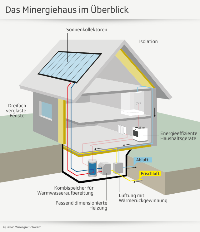 Minergie ist ein Schweizer Qualitätslabel für nachhaltiges Bauen. Ziel ist ein niedriger Energieverbrauch dank guter Wärmedämmung sowie systematischer Lufterneuerung durch eine Lüftung. Minergie-Häuser sollen ohne Erdgas und Erdöl auskommen und stattdessen auf Wärmepumpen und Sonnenenergie setzen. Die Marke gehört dem 1998 gegründeten Verein Minergie SchweizExterner Link, der von Bund und Kantonen getragen wird. Die nationalen Markenrechte erstrecken sich auf die Schweiz, Liechtenstein, Deutschland und Japan.