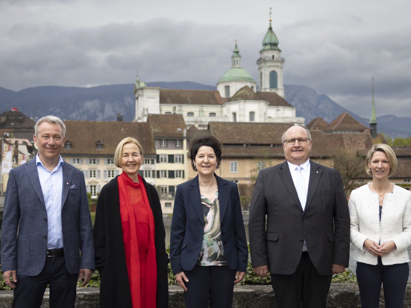 Dem Regierungsrat gehören drei Frauen und zwei Männer an: Sandra Kolly (Mitte), Susanne Schaffner (SP), Sibylle Jeker (SVP), Peter Hodel (FDP) und Mathias Stricker (SP).