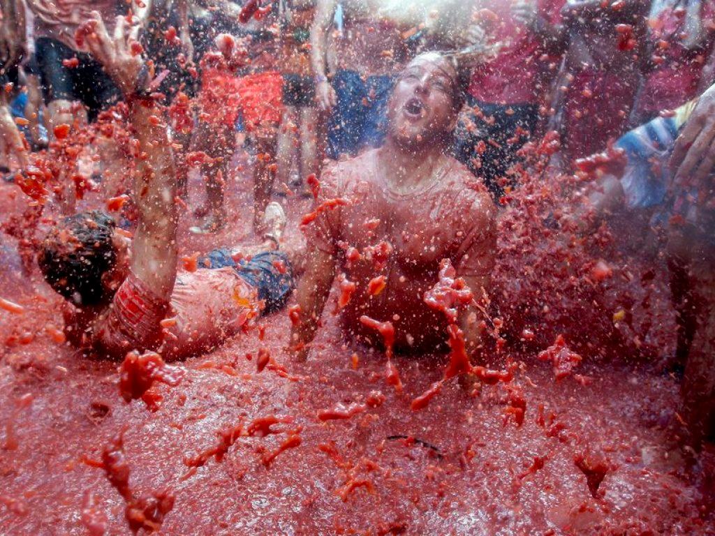 (Keystone-SDA) Einmal im Jahr sieht der der kleine ostspanische Ort Buñol rot, am Mittwoch war es wieder so weit: Etwa 22’000 Besucher stürzten sich in «La Tomatina», ein verrücktes Spektakel, bei dem sich alle mit Tomaten bewerfen und in der Tomatenmatsche wälzen.