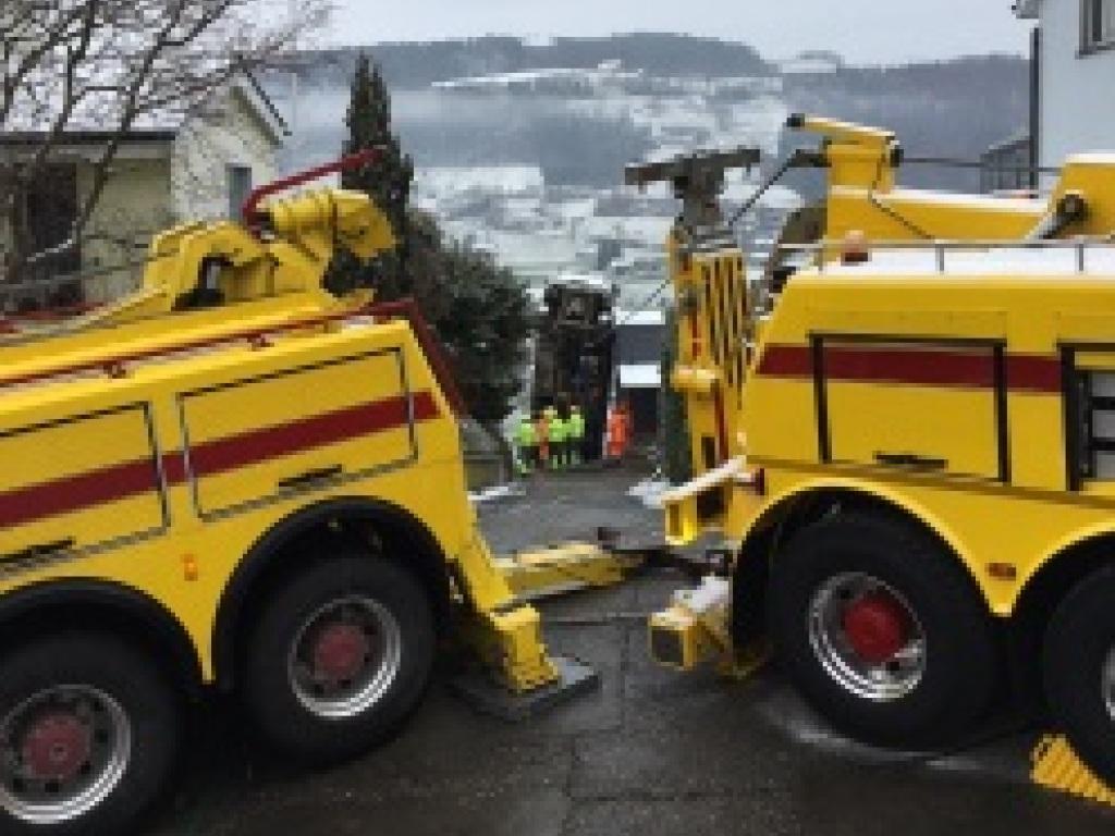 Spezialkräne müssen verunfallten Tanklastwagen bergen