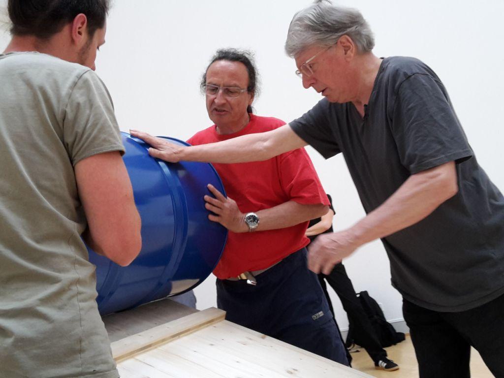 Um das Fass in Bewegung zu setzen, legte Signer am Dienstag im Oberlichtsaal des Museums selber Hand an: Von einem schrägen Podest liess er das schwere, mit 50 Litern Wasser gefüllte Blechfass ins «Feld» rollen. Mit der so entstandenen Schneise quer durch unzählige in den Boden gesteckte Holzstäbe zeigte sich Signer zufrieden. Die Schneise bleibt für die Ausstellung so bestehen.