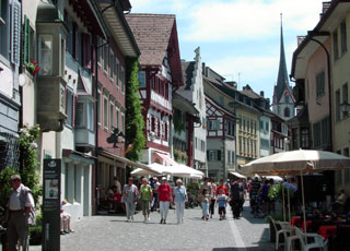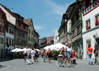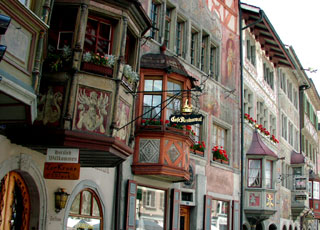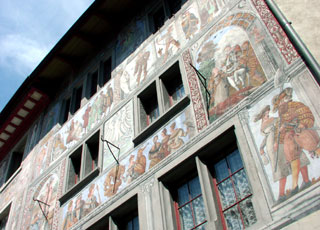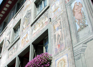 Die Gebäude am Rathausplatz sind alle mit Wandmalereien geschmückt. Viele sind dem Tier oder Objekt gewidmet, dessen Name das Haus trägt, z.B. Sonne, Roter Ochse oder Weisser Adler. Es soll einer der meistfotografierten Plätze der Schweiz sein.