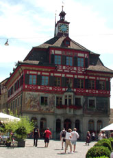Das Rathaus dominiert das Zentrum von Stein am Rhein. Es wurde von 1539 bis 1542 gebaut, die Wandmalerei erhielt es aber erst 1900. Es dient immer noch als Rathaus der kleinen Stadt.