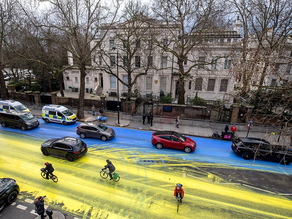 (Keystone-SDA) Aus Protest gegen den Krieg in der Ukraine haben Demonstranten am Donnerstag die Strasse vor der russischen Botschaft in London in den Farben der ukrainischen Flagge eingefärbt.