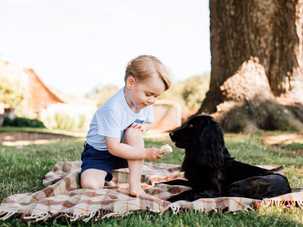 Auf einem Bild ist George mit Familienhund Lupo zu sehen. George, der wie seine Urgrossmutter Queen Elizabeth II. ein Herz für Tiere hat, kniet auf einer Picknickdecke und bietet Lupo etwas zum Fressen an, das aussieht wie Eiscreme.