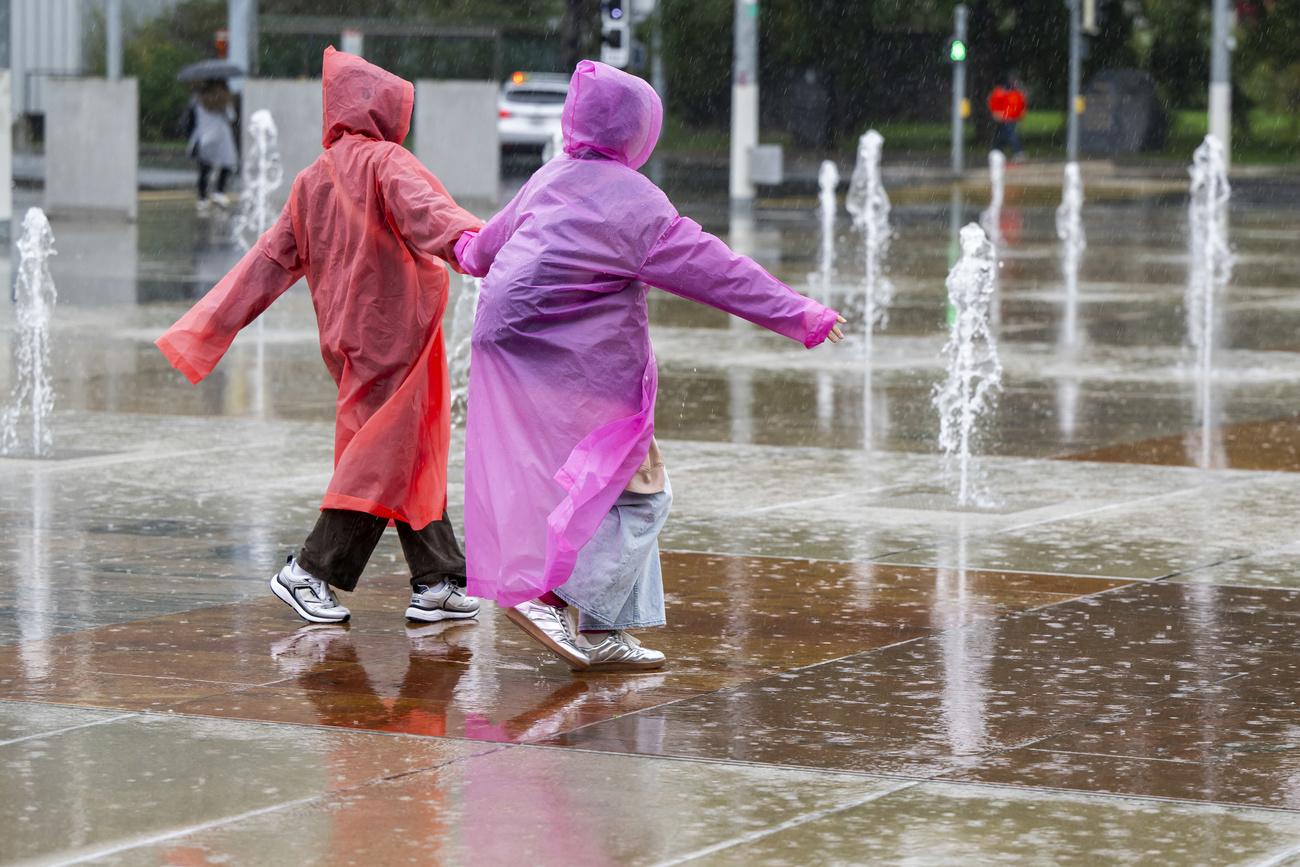 Für heute hatte Meteo Schweiz eine Warnung der Stufe drei für Niederschläge und starken Regen angekündigt. Diesen Feriengästen schien das Regenwetter nichts anzuhaben, sie tanzten in ihren Pelerinen im Regen und vor den Fontänen des Brunnens auf der Place des Nations in Genf.